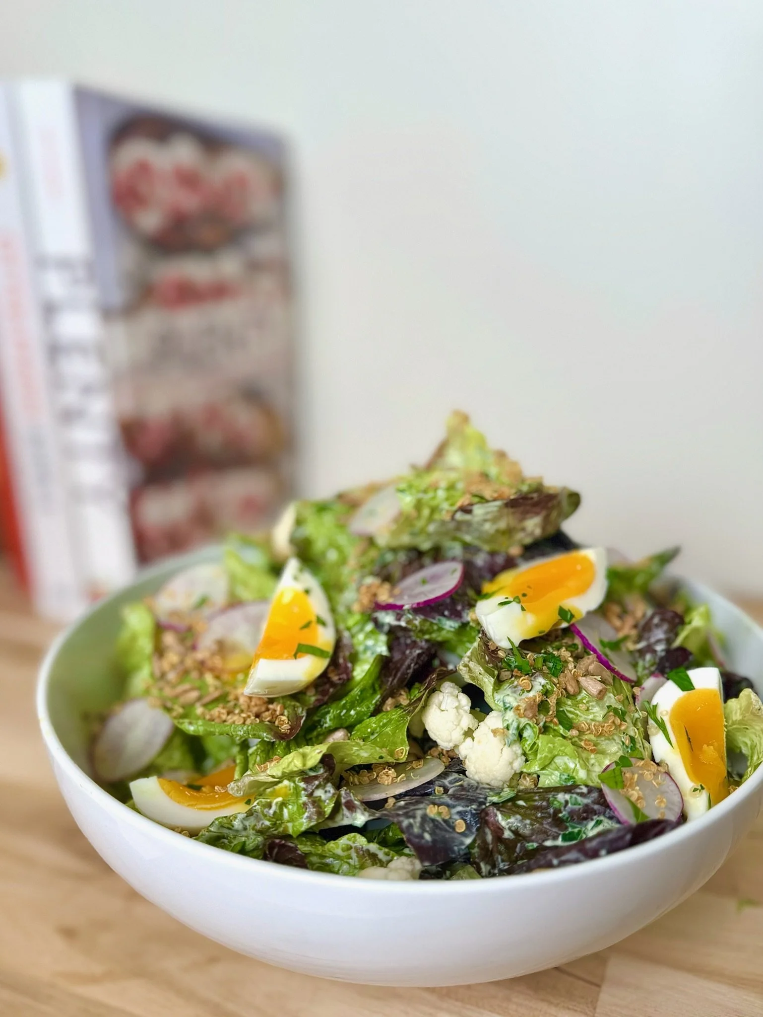 Garnish the salad with the roasted vegetables, a halved 7 minute egg▸, crispy quinoa, toasted sunflower seeds and sliced radish.