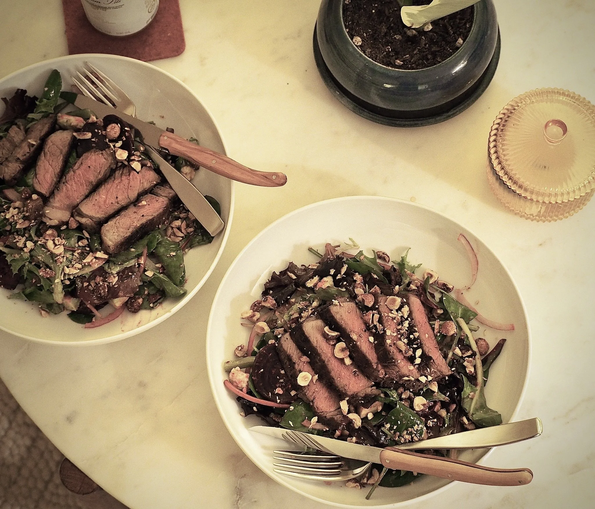 If you're looking for a salad that eats like a meal, this one’s got your name all over it—tender greens piled with juicy seared hanger steak, tangy blue cheese, and sweet pickled red onions. Toasted hazelnuts add crunch, and a zesty sherry vinaigrette ties it all together.