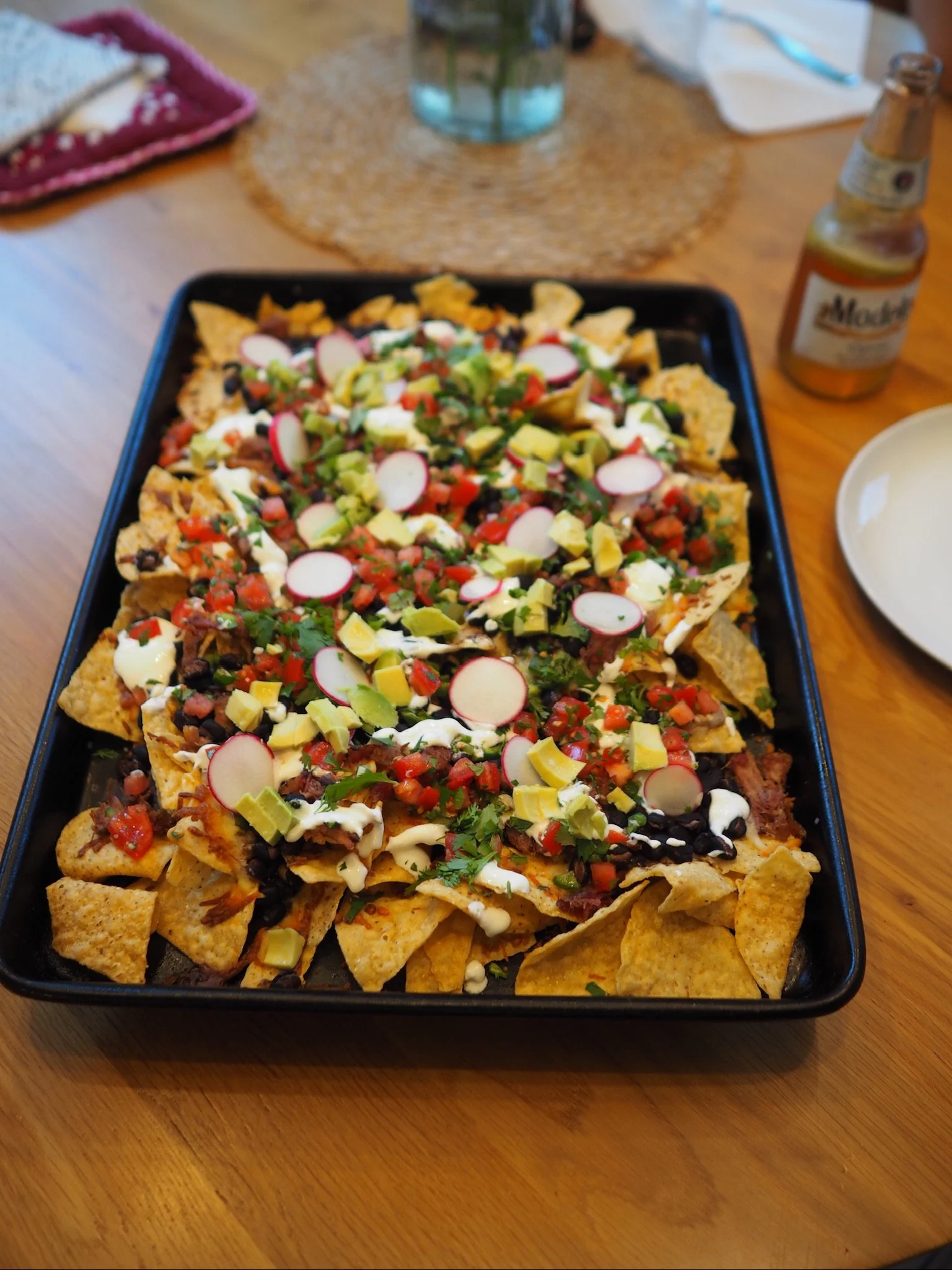 Remove chips from oven. Top with spoonfuls of pico de gallo, avocado slices, radish, and a drizzle of crema. Garnish with extra cilantro leaves and a squeeze of lime.
